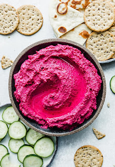 In a food processor or high-speed blender combine the chickpeas, beet, garlic, tahini, olive oil, and salt. Process on high until smooth, stopping as needed to scrape down the sides and underneath the blade with a rubber spatula.